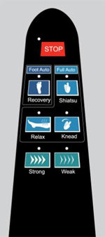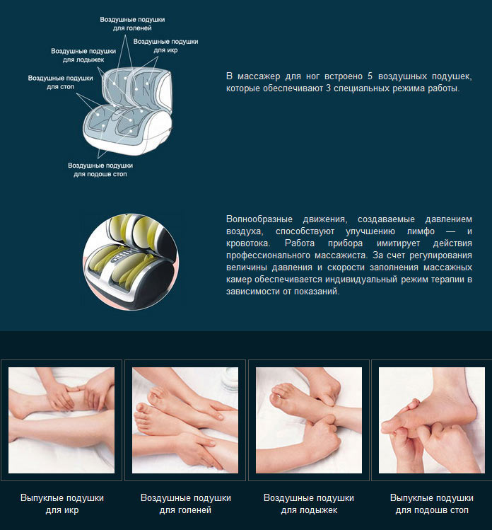 Расслабление — попеременная работа воздушных подушек выполняет мягкое разминание пальцев, стоп, голеней и икр, достигая эффект полного расслабления мышц ног.