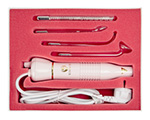 Компактный импульсный массажёр имеет в комплекте 4 насадки. Это специальные стеклянные электроды разной формы, наполненные неоном или воздухом. Девайс можно использовать 2-мя способами: контактным (т.е. касаясь насадкой кожи) и бесконтактным (когда электрод находится на расстоянии 1-4 мм от кожи). Первый метод эффективен, например, при лечении целлюлита и варикоза, второй способен обеззараживать кожу (без химических повреждений), помогая бороться с угревой сыпью и ускорять заживление ран.